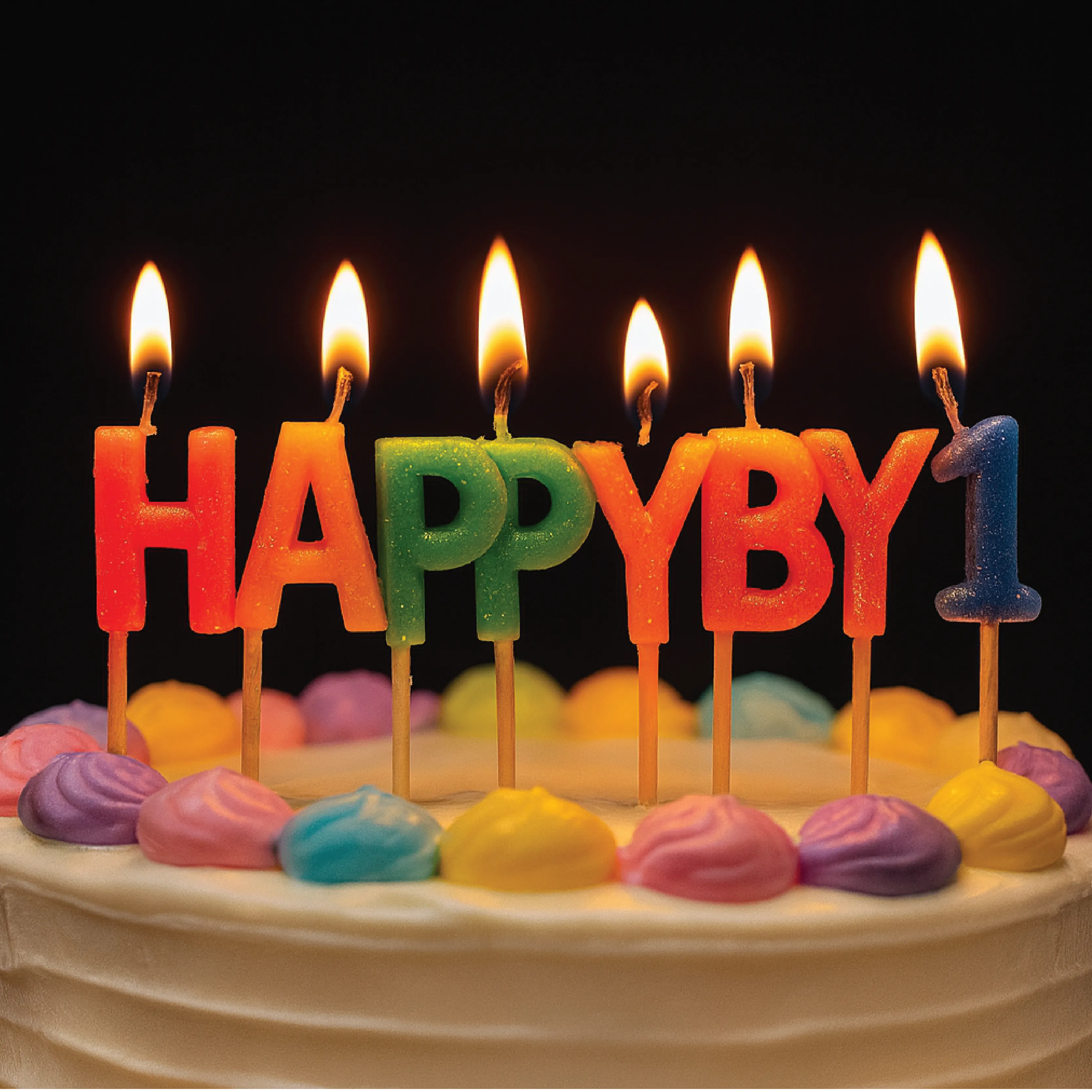 Includes: “HAPPY BIRTHDAY” letters + number “1” candle