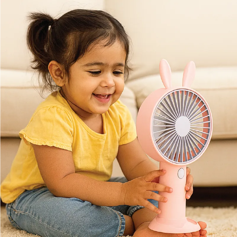 Equipped with USB rechargeable battery, it offers long-lasting cooling and multiple speed settings. The compact design makes it ideal as a desk fan, handheld fan, or bedside companion during hot days.