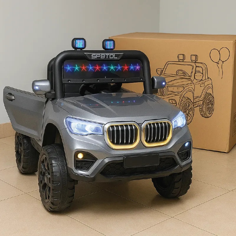 Give your child a premium driving experience with this BMW Style Kids Electric Ride-On Jeep. With its elegant grey finish, BMW-inspired dual front grill, and colorful LED roof lights, this ride-on toy offers style, safety, and entertainment. A 12V rechargeable battery and parental remote ensure both independence and controlled safety.
