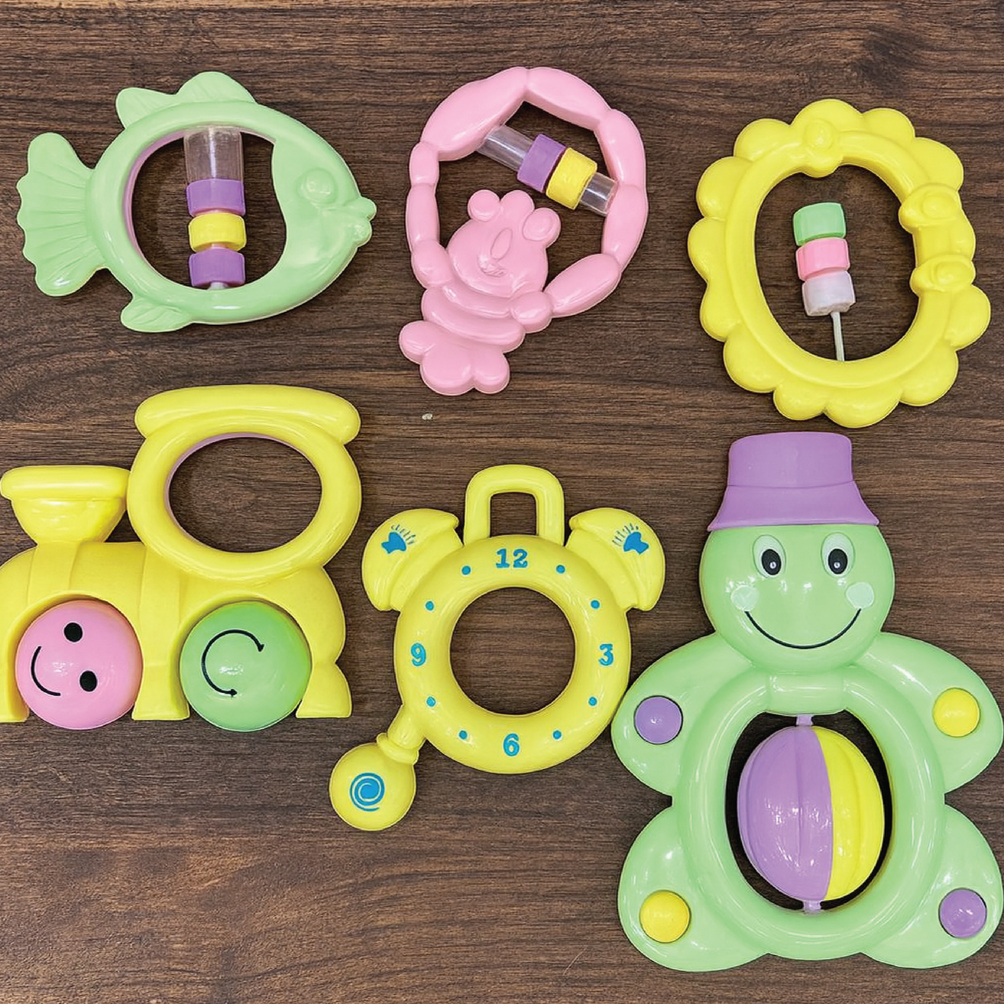 Set Includes: 6 colorful rattle toys (fish, crab, turtle, clock, vehicle, and flower designs)