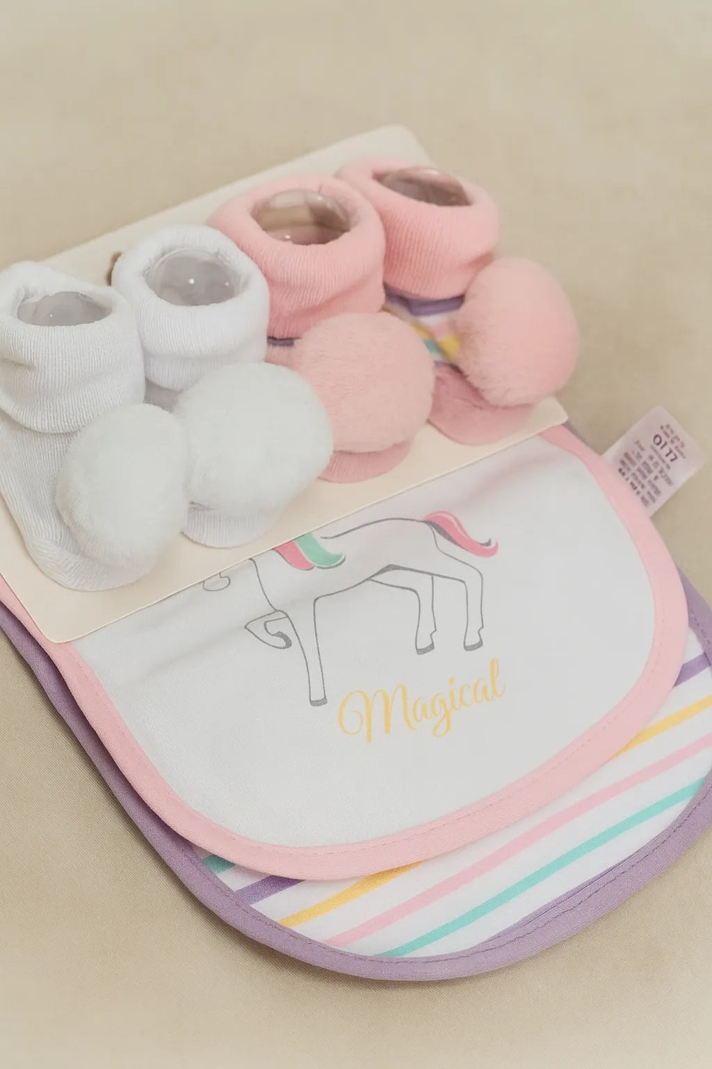 Make your baby’s everyday moments extra special with our Magical Unicorn Baby Gift Set! This adorable 4-piece set includes two ultra-soft bibs and two pairs of cozy pom-pom booties, designed to keep your little one stylish, comfortable, and clean. The bibs feature pastel hues with a charming unicorn print and the word “Magical,” adding a dreamy touch to mealtime. The matching booties in pink and white come with fluffy pom-poms, offering a gentle, snug fit perfect for newborns.