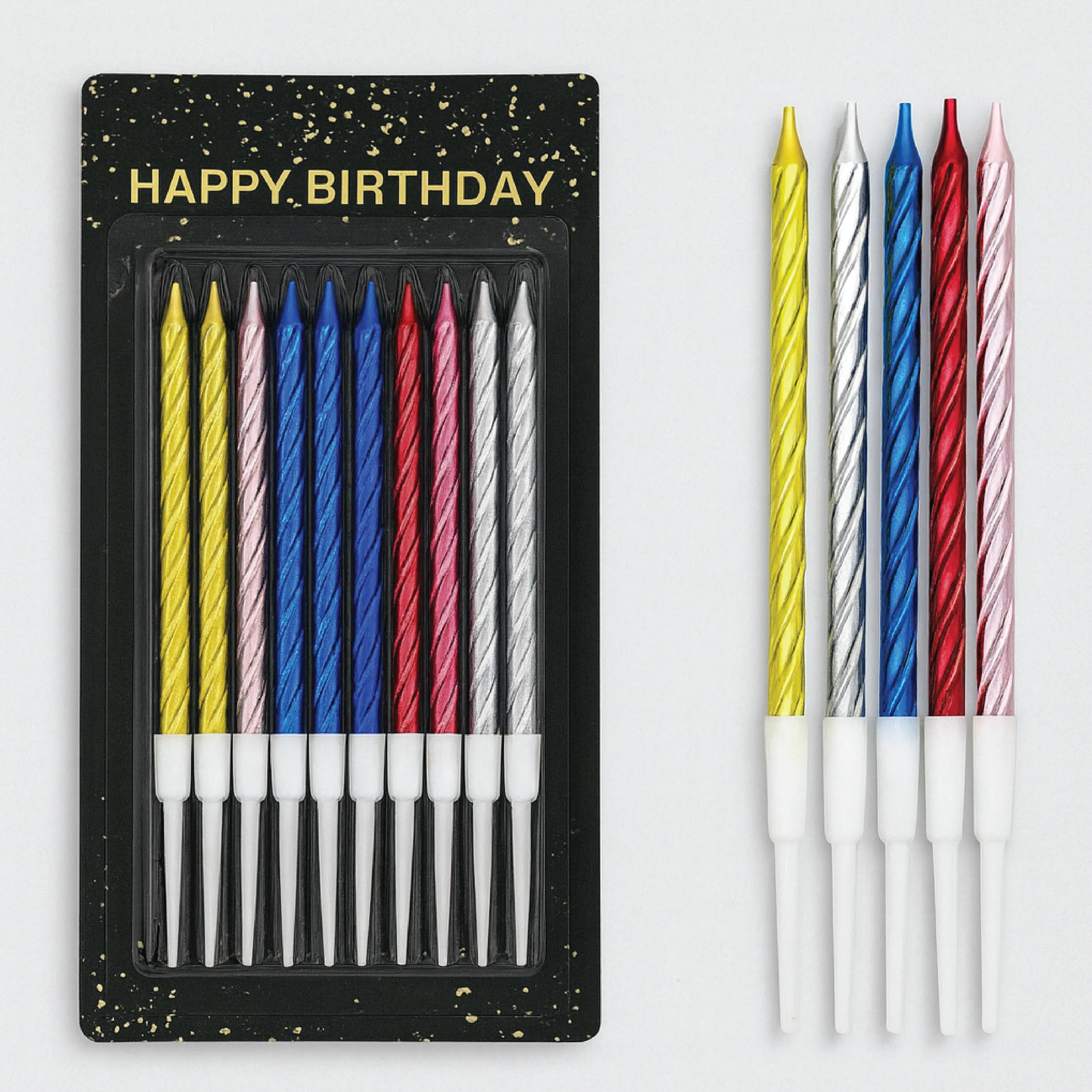 Make every birthday celebration shine with these stunning Metallic Birthday Candles! Featuring 12 spiral candles in vibrant metallic shades of gold, pink, blue, red, and silver, they bring a touch of glamour to any cake. Their sleek design and reflective finish make them perfect for adults and kids alike. Each candle burns evenly with a steady flame, ensuring picture-perfect moments while blowing them out. Ideal for birthdays, anniversaries, or milestone celebrations, these candles instantly elevate your party décor with elegance and sparkle.